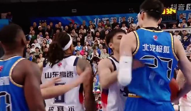 第四节赛场突发火药味!比赛还剩下8分钟34秒,山东外援珀赛尔杀入北京队禁区,一跃而起双脚腾空隔扣了周琦,