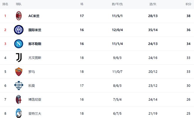 在积分榜上,AC米兰以38分排名榜首。国际米兰紧随其后,拿到36分,只落后2分。而且,国际米兰比AC米兰少赛一场,接下来有机会重夺榜首位置。那不勒斯以34分排名第3。前3名的差距还是很小。尤文图斯只拿到1分,总积分是33分,排名第4。输球的罗马依然是33分,排名第5。科莫以30分排名第6。博洛尼亚26分排名第7。亚特兰大升到第8名,总积分是25分。